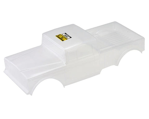 Modeled after vintage military and utility vehicles, it features a boxy, utilitarian shape with flat panels, angular lines, and a distinctive front-end design for a rugged, classic look. Made from durable, clear polycarbonate, it includes a separate cab and bed design for customization flexibility. The body is compatible with various 12.3” wheelbase crawlers and includes protective overspray film, window masks, and a detailed decal sheet for a polished finish.